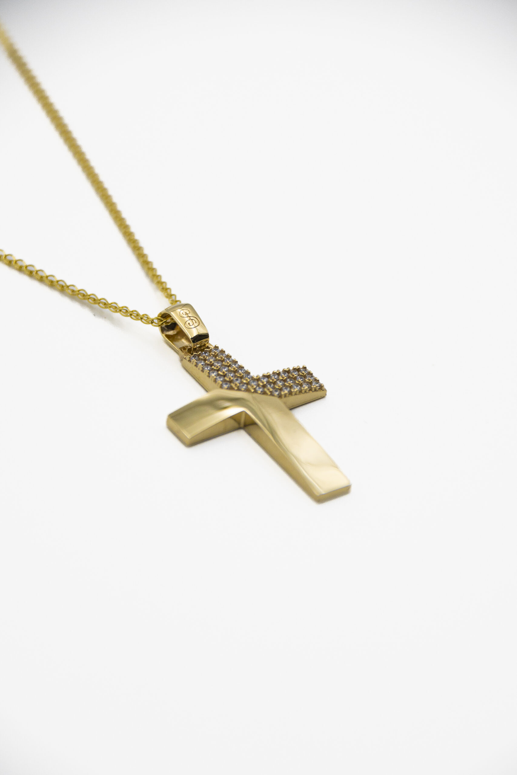 Χρυσός σταυρός γυναικείος με χαλκά διακοσμημένος με πολλές γυαλιστερές πέτρες ζιργκόν. Ιδανικός και για βαπτιστικός.