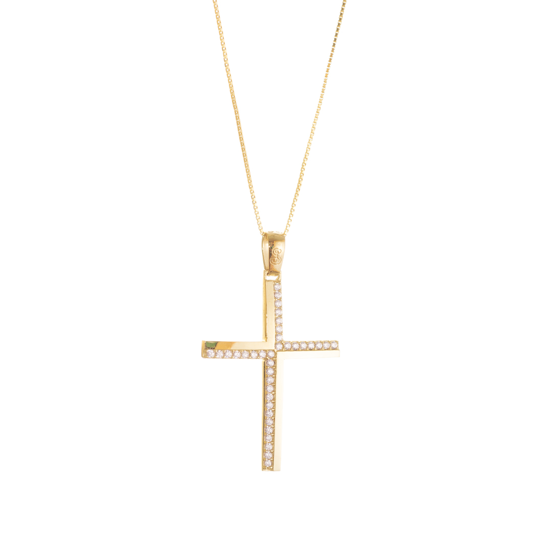 Χρυσός σταυρός γυναικείος με χαλκά και με πέτρες ζιργκόν.Ένα λεπτοκομμένο και μοντέρνο σχέδιο για σικ εμφανίσεις.