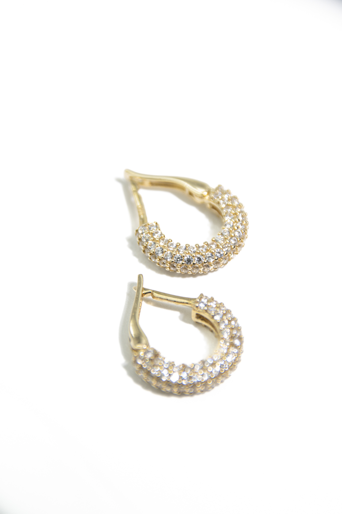 Χρυσά σκουλαρίκια κρίκοι δεκατεσσάρων καρατίων με λευκά ζιργκόν, ιδανικά για να τα φοράς από το πρωί ως το βράδυ!
