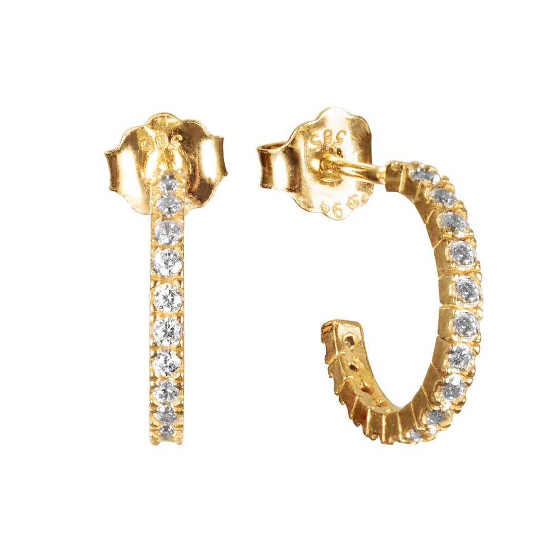 Χρυσά σκουλαρίκια δεκατεσσάρων καρατίων σε σχήμα κρίκου με κούμπωμα “πεταλούδα”, στολισμένα με μικρές πέτρες ζιργκόν ιδανικά για να τα φοράς από το πρωί ως το βράδυ είτε μόνα τους είτε σε συνδυασμό με μια ακόμη επιλογή στην δεύτερη τρύπα από τα αυτιά. Το σχέδιο αυτό βγαίνει σε δύο μεγέθη, το συγκεκριμένο είναι το Νο2 και το μεγαλύτερο.