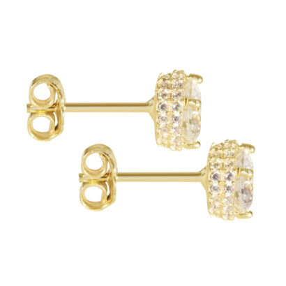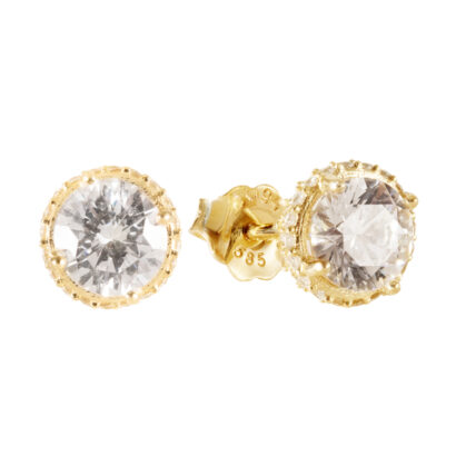 Καρφωτά σκουλαρίκια χρυσά με κεντρική λευκή πέτρα περιτριγυρισμένη από διπλή σειρά με μικρότερα λαμπερά ζιργκόν. Ιδανικά για να στολίσετε τα αφτιά σας από το πρωί έως το βράδυ. Ένα μοντέρνο σχέδιο, όμορφο και εντυπωσιακό!