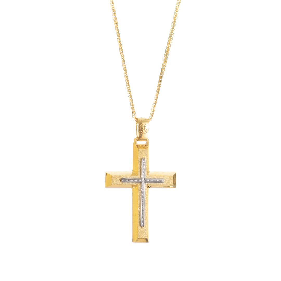 Χρυσός σταυρός ανδρικός με καπάκι λευκόχρυσο με χαλκά και ζαγρέ φινίρισμα .Μοντέρνος ιδανικός και για βαπτιστικός.