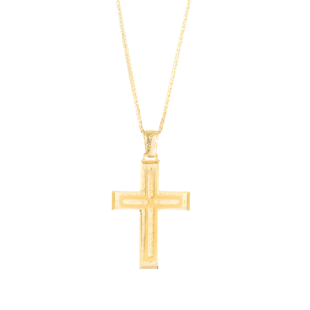 Χρυσός σταυρός ανδρικός με καπάκι χρυσό λουστρέ με χαλκά και ζαγρέ φινίρισμα .Μοντέρνος ιδανικός και για βαπτιστικός.