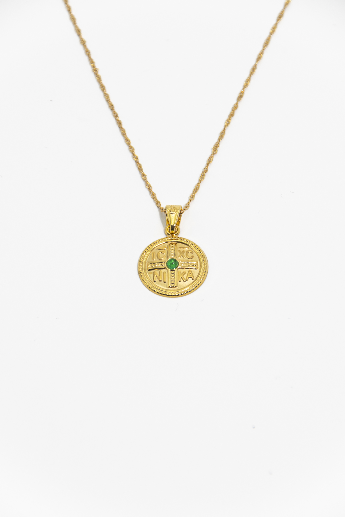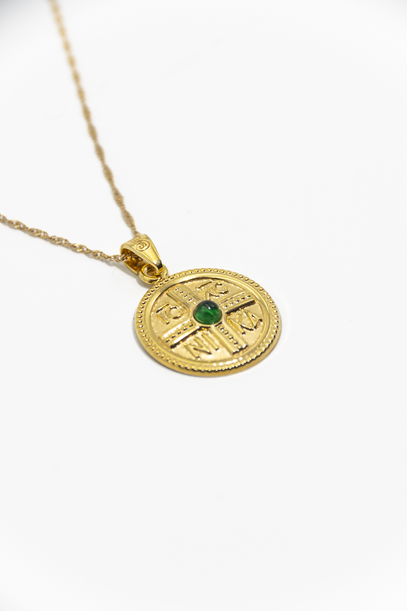 Χρυσό μενταγιόν δεκατεσσάρων καρατίων με βυζαντινό σχέδιο, διακοσμημένο με την επιγραφή «IC XC NIKA» και μια πράσινη πέτρα στο κέντρο του. Ένα διαχρονικό σύμβολο πίστης και προστασίας, ιδανικό για να φορεθεί καθημερινά ή να προσφερθεί ως δώρο.
