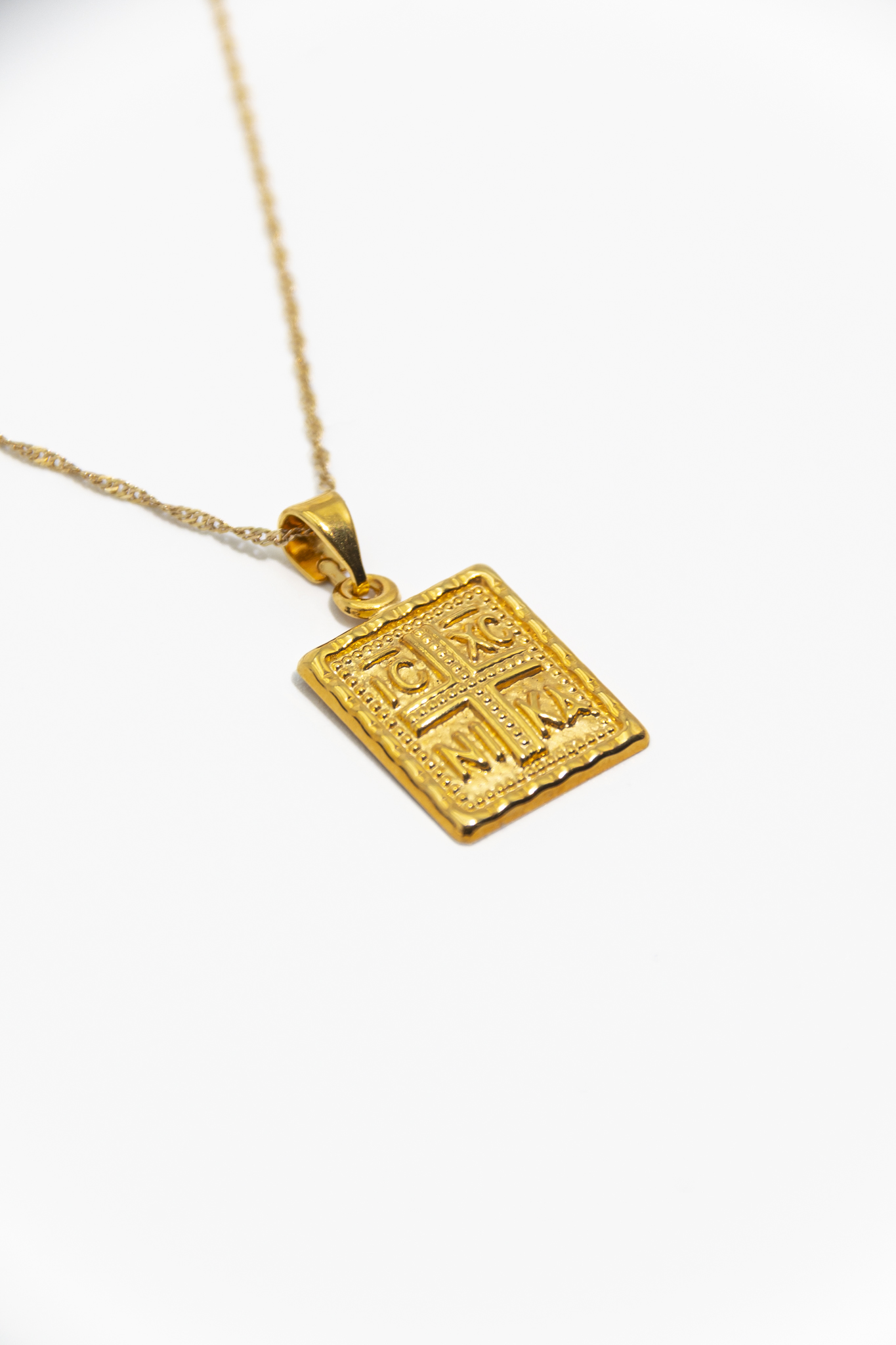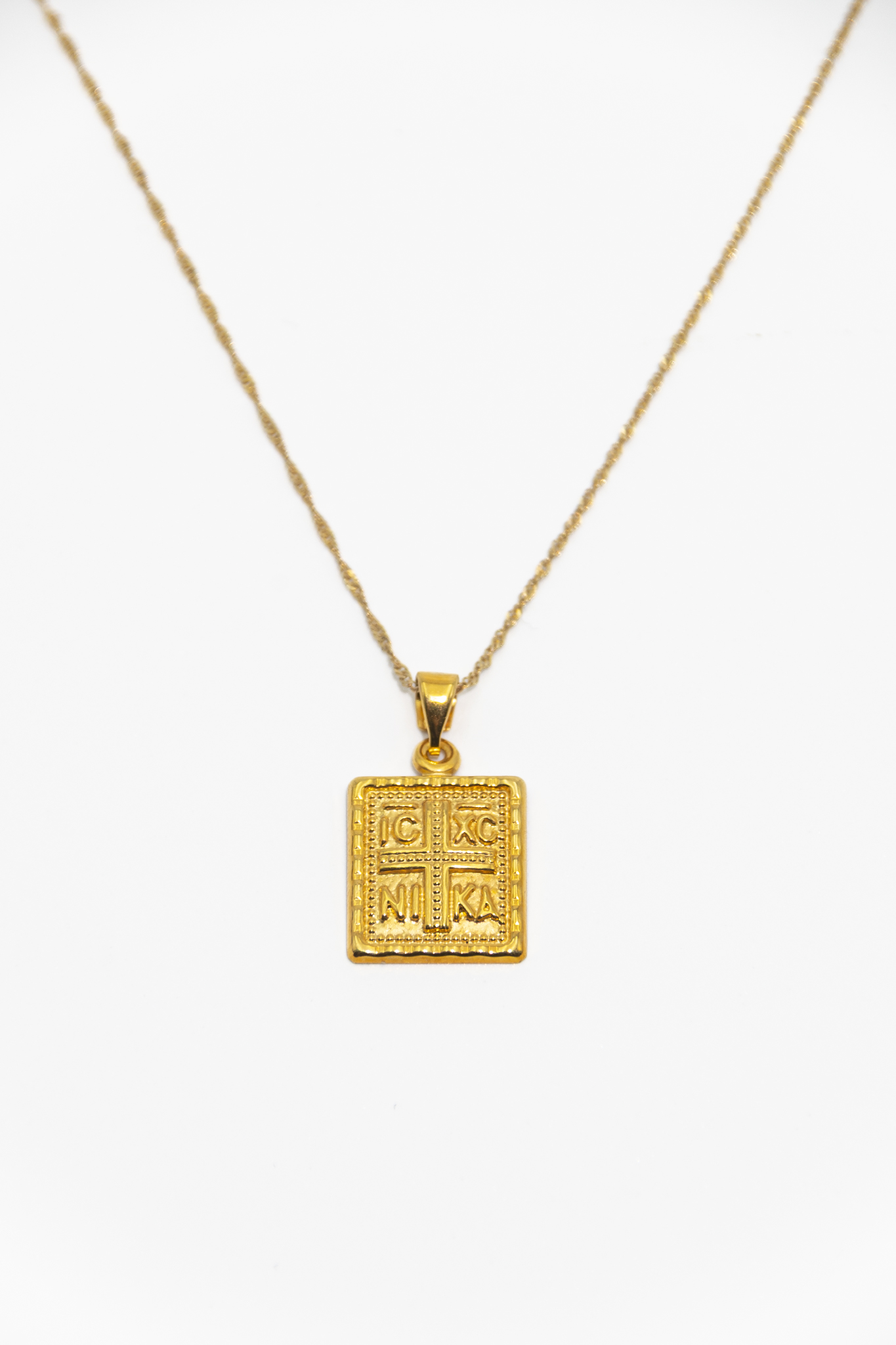 Χρυσό μενταγιόν δεκατεσσάρων καρατίων με βυζαντινό σχέδιο, διακοσμημένο με την επιγραφή «IC XC NIKA». Ένα διαχρονικό σύμβολο πίστης και προστασίας, ιδανικό για να φορεθεί καθημερινά ή να προσφερθεί ως δώρο.