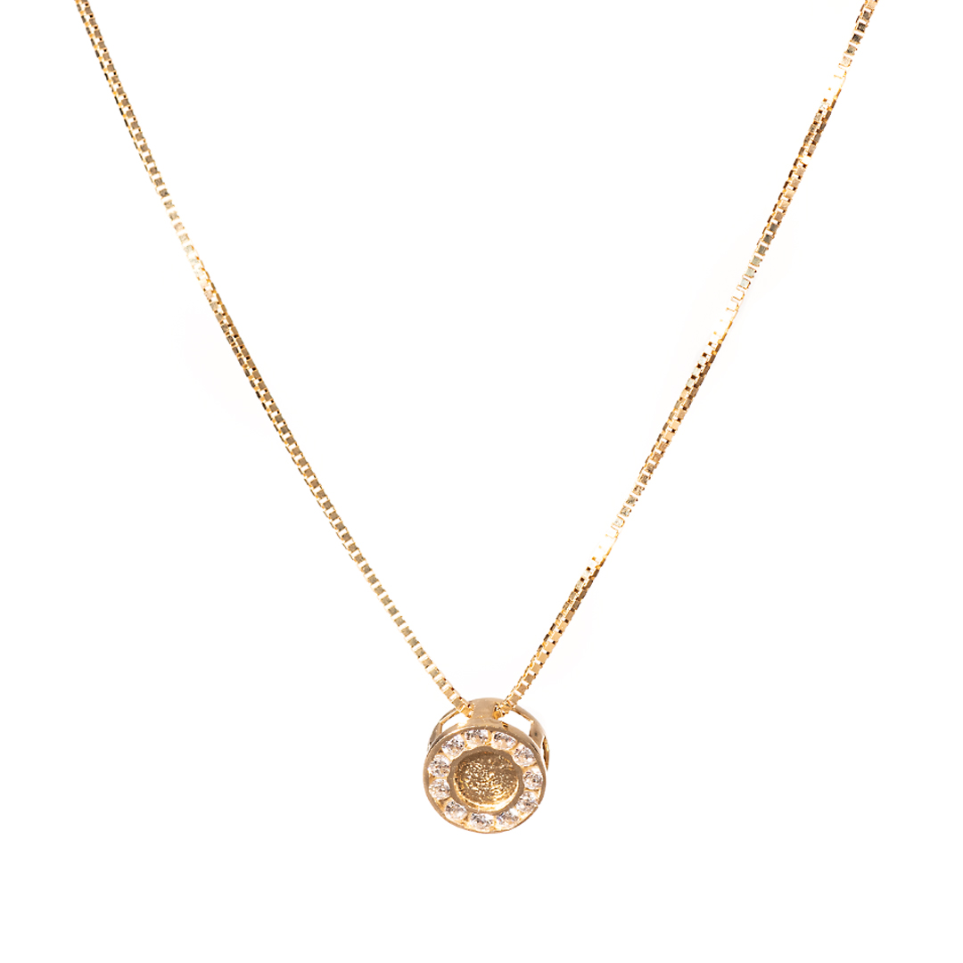 Μενταγιόν χρυσό σε στρογγυλό σχήμα στολισμένο με πέτρες ζιργκόν. Αυτό το μενταγιόν το φοράτε εύκολα από το πρωί έως το βράδυ και μπορείτε να το συνδυάσετε εύκολα και με άλλα κοσμήματα. Η αλυσίδα της φωτογραφίας είναι ο κωδικός ‘ALG5’.